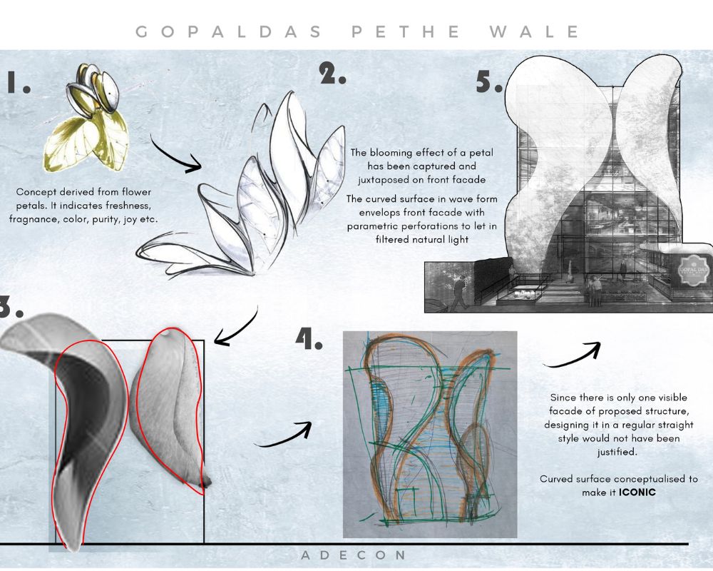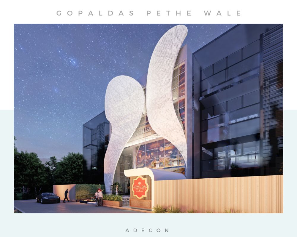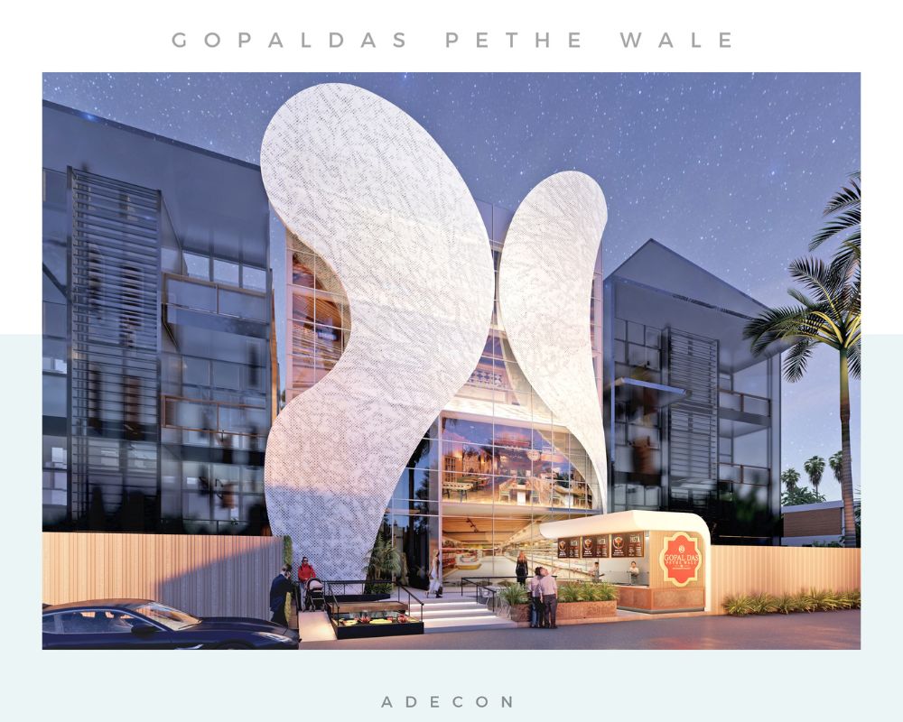 The architectural design for the Gopaldas Pethe Wale commercial complex embodies a seamless dialogue between heritage and modernity, conceived to create a bold and memorable urban identity. A sculptural, flowing white façade forms the defining element of the structure – symbolizing the brand’s timeless elegance and forward-looking spirit.