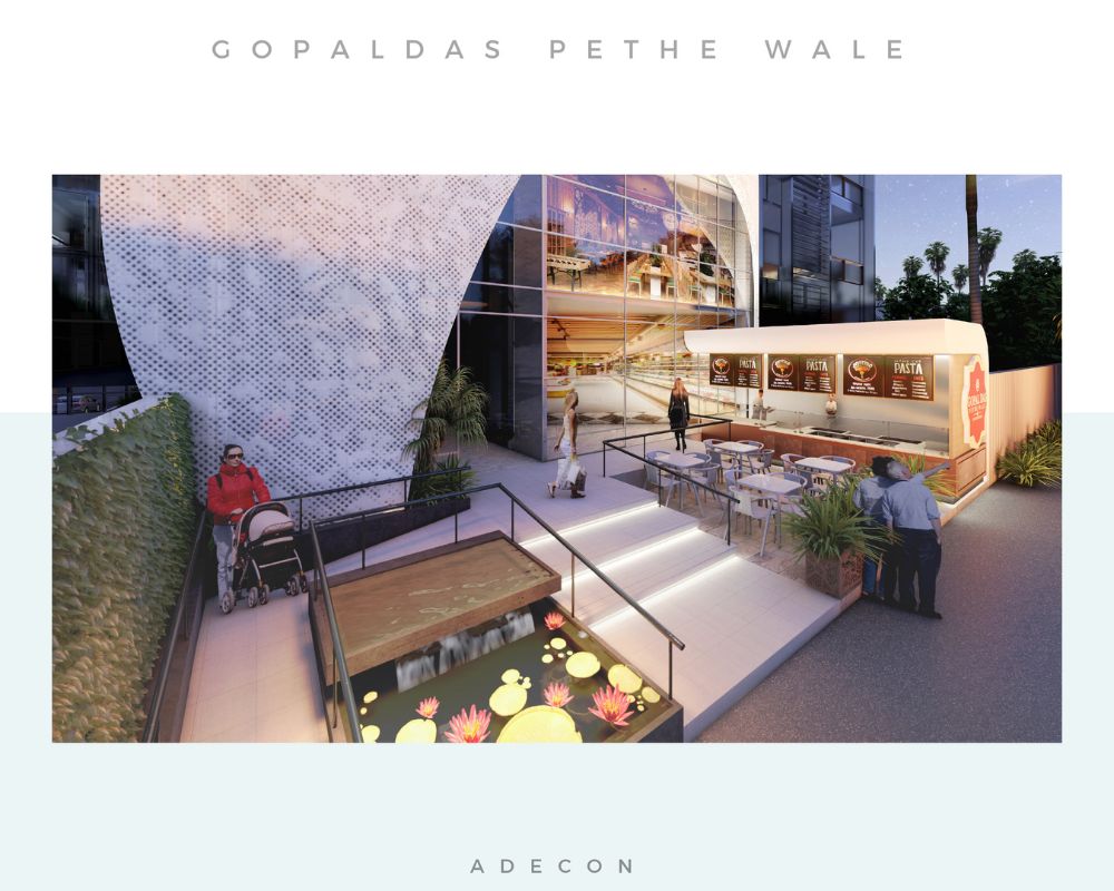 An accessible forecourt leads into layered interior volumes, articulated through refined materials such as glass and natural wood. Each design decision reinforces the dual vision of legacy and innovation – honoring the rich heritage of Gopaldas Pethe Wale while positioning it confidently for the future.