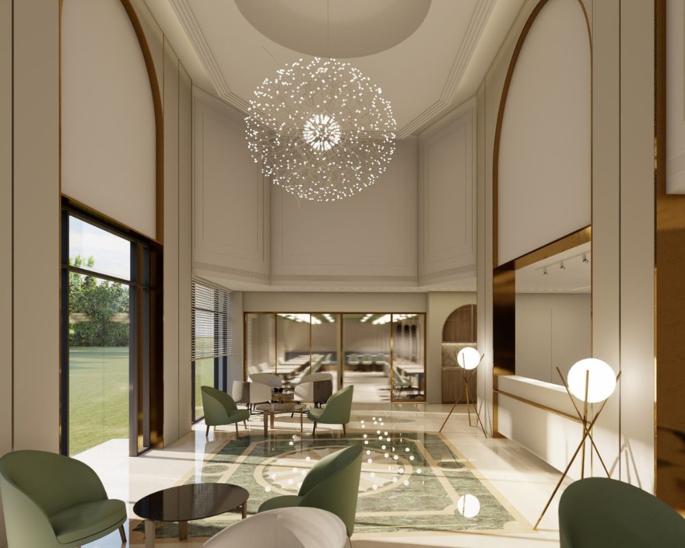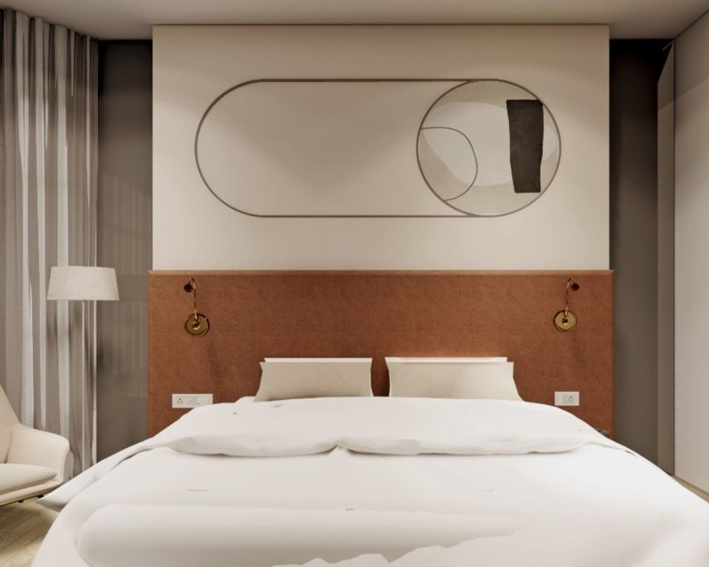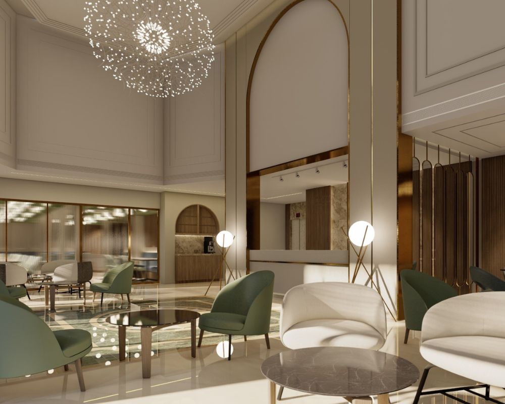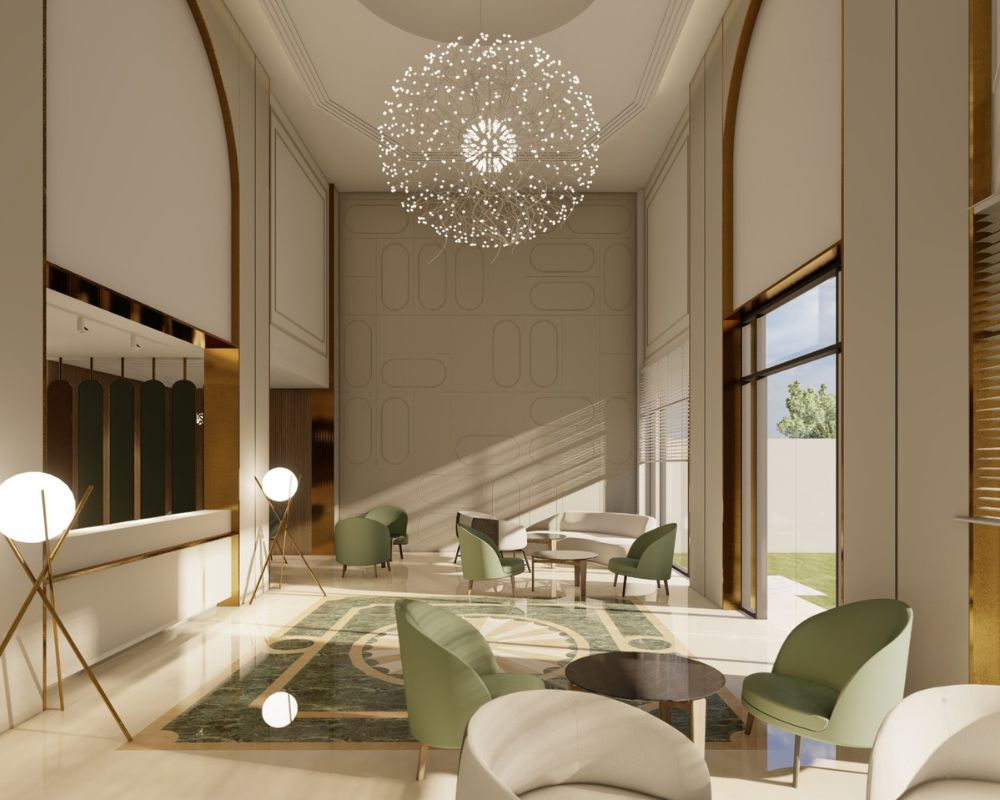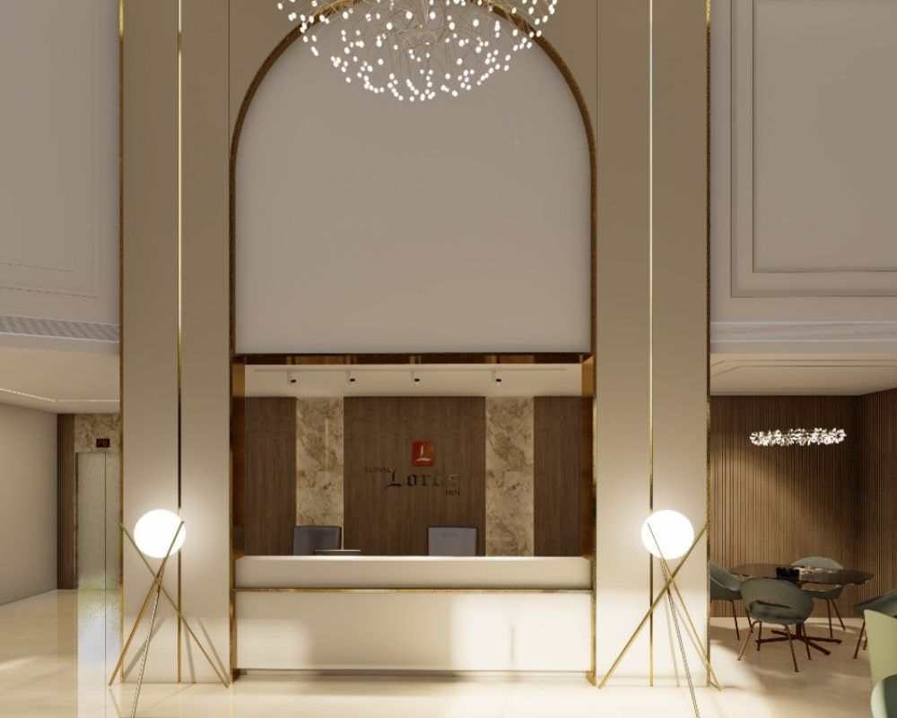 The façade balances modern simplicity with cultural nuance-featuring perforated screens and textured stone that filter natural light and promote ventilation. Inside, a grand double-height lobby sets the tone for sophistication, while thoughtfully planned guest rooms and rooftop dining spaces offer comfort, connectivity, and panoramic city views.