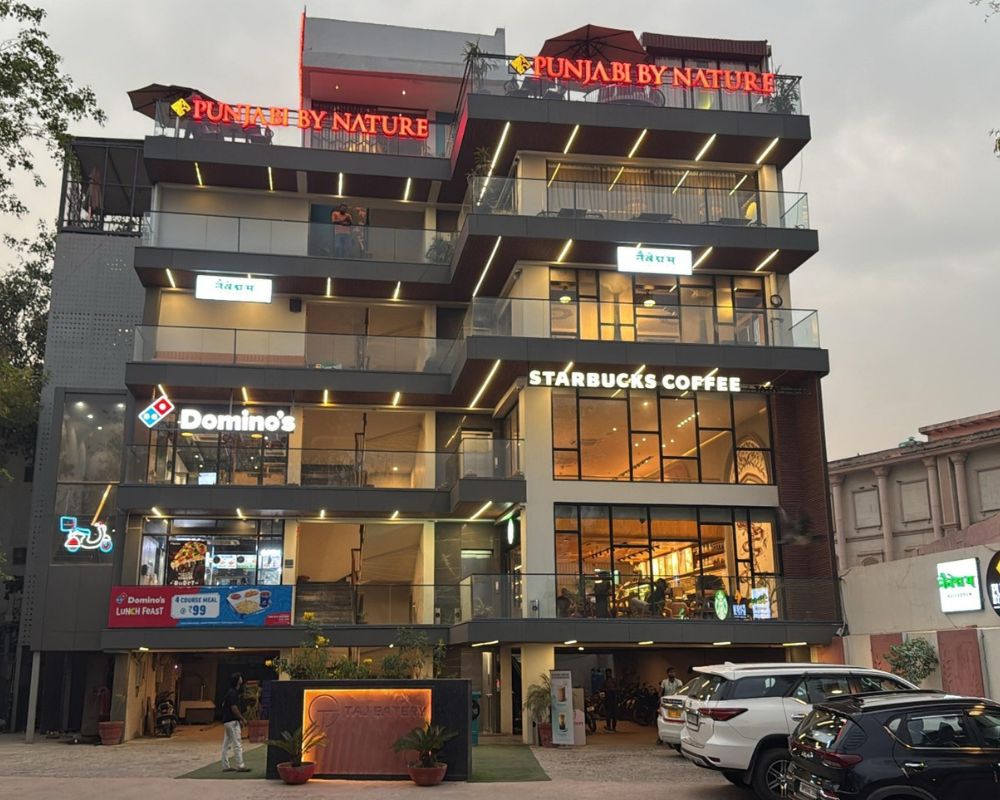 Taj Eatery, a 12,000 sq.ft. multi-level commercial hub on Agra’s heritage road to the Taj Mahal, redefines contemporary retail and dining architecture. Its clean modern lines, extensive glazing, and layered terraces create a dynamic street presence while ensuring visibility for diverse eateries. The anchor outlet, Starbucks, marks the brand’s debut in the city, complemented by popular names like Domino’s, Naivedyam, and Punjabi by Nature. Thoughtful urban placement, integrated lighting, and a striking façade make Taj Eatery both a culinary and architectural landmark. The project reflects Adecon’s vision of vibrant, functional, and contextually sensitive commercial spaces.