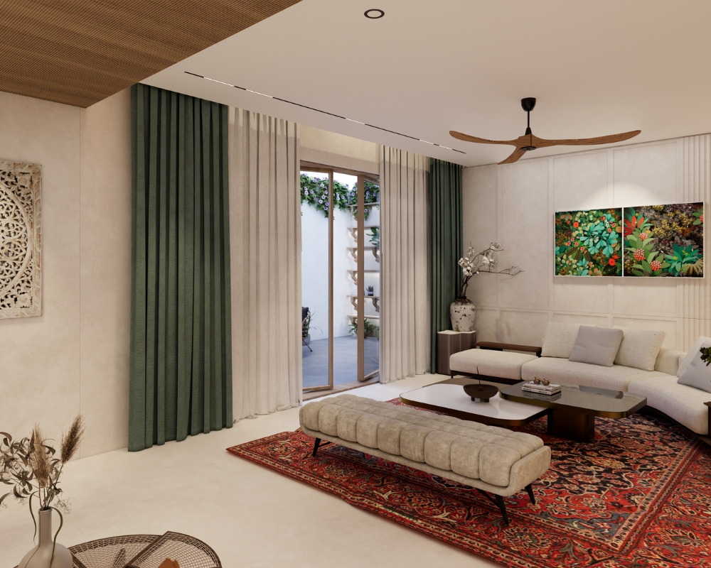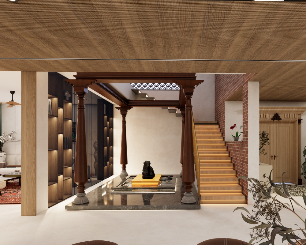 Villa Vernara, a 7000 sq. ft. residence in Agra, is a serene retreat that unites contemporary design with cultural depth and natural elements. Designed for Mr. Ajay Agarwal, the home balances tradition and modern comfort through clean lines, exposed brickwork, and lime/micro-concrete finishes. At its heart lies a dramatic triple-height courtyard, centered around a tranquil water feature and an intricately sculpted idol of Nandi Ji-a space of reflection, peace, and spiritual connection. Villa Vernara exemplifies ADeCon’s philosophy of weaving culture into modern living, offering residents a lifestyle that feels timeless, soulful, and deeply rooted in elegance.